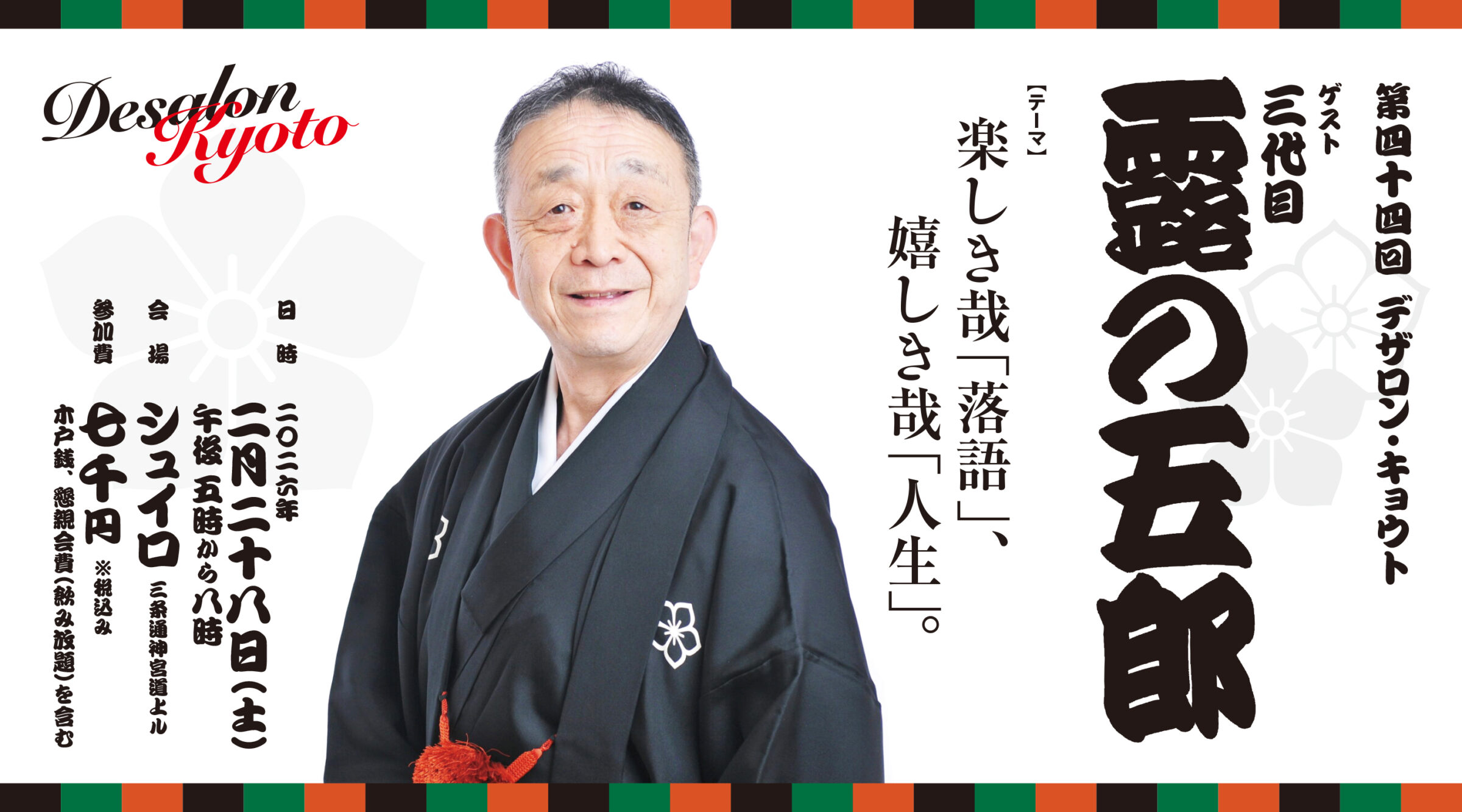 今回は、2025年10月に三代目を襲名された落語家 露の五郎師匠をゲストにお迎えして、『楽しき哉「落語」、嬉しき哉「人生」』と題してトークを展開します。トークの前後には、師匠の落語もあり、イベントの後半は飲食をしながらの懇親会もセットとなったイベントです。会場は、京都岡崎にあるシュイロ。近くには、京都市京セラ美術館、京都国立近代美術館、ロームシアター京都、京都市動物園、平安神宮など、イベント前に散策するのも楽しいロケーションです。
